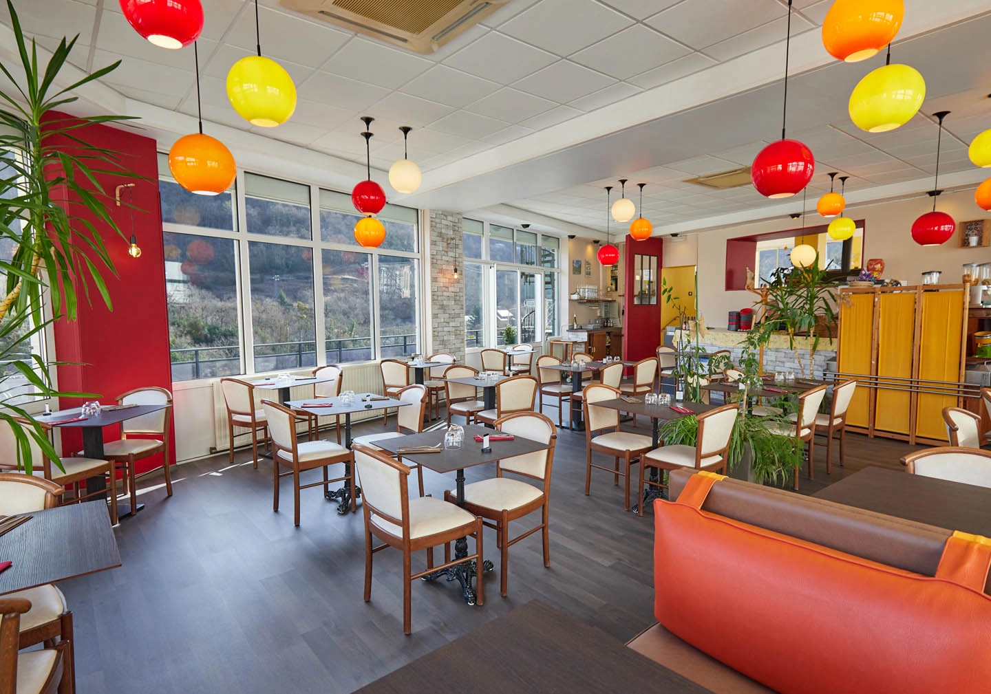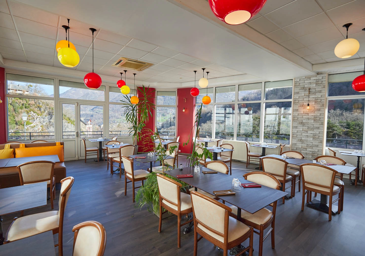 En traversant la rue pour vous restaurer, découvrez notre restaurant à Luz-Saint-Sauveur avec sa salle vue panoramique de 40 couverts, spacieuse, lumineuse et climatisée, 20 couverts en terrasse, en surplomb du gave de Pau.